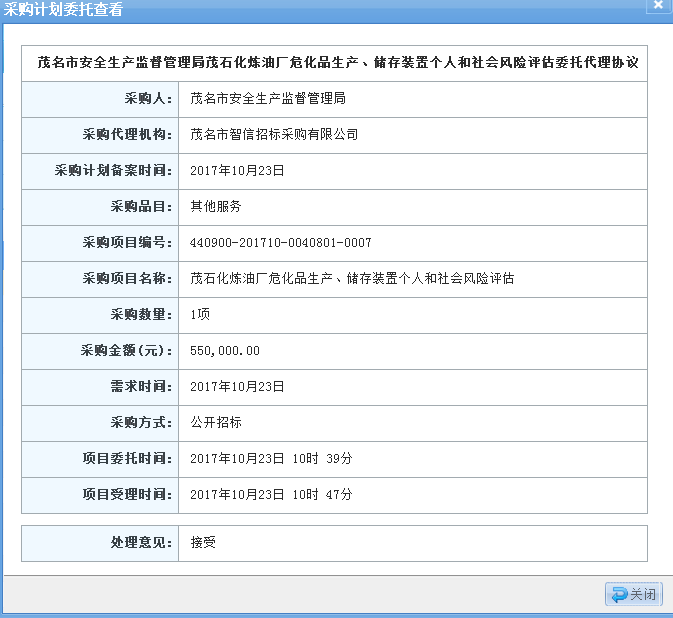 茂名市智信招標采購有限公司 受 茂名市安全生產監督管理局的委托,對 茂石化煉油廠危化品生產、儲存裝置個人和社會風險評估 進行公開招標采購,歡迎符合資格條件的供應商投標。