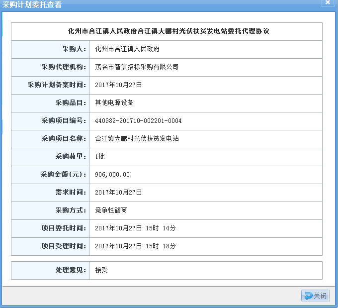 茂名市智信招標采購有限公司 受 化州市合江鎮人民政府 的委托,擬對 合江鎮大鵬村光伏扶貧發電站 進行競爭性磋商,歡迎符合資格條件的供應商參加。本項目將優先確定符合相應資格條件的自主創新產品、節能產品、環保產品供應商參加談判。